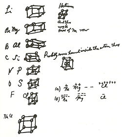 מימין – איכלוס אלקטרוני בקליפה חיצונית, מתוך מחברותיו של לואיס, משמאל – איכלוס 79 אלקטרונים באטום זהב לפי מודל ‘קליפות’ פשוט, איור: Pumbaa(original work by Greg Robson) מויקיפדיה. מודל לא מדוייק.