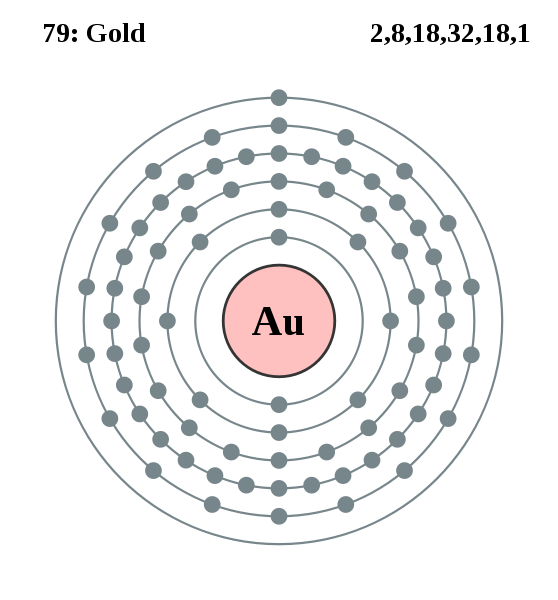 [Xe] 4f14 5d10 6s1 כלומר – הוא מכיל סידור אלקטרונים זהה כמו לגז האציל קסנון (Xe) ועוד 14 אלקטרונים באורביטל 4f, עשרה אלקטרונים באורביטל 5d ואלקטרון בודד באורביטל 6s. זאת בהשוואה אל המתכת האלקלית ציזיום (שמוצגת לפי הסימון של לואיס: Cs•) שנמצאת בתחילת השורה של הזהב לפי סידור הטבלה המחזורית, שבה סידור האלקטרונים הוא [Xe] 6s1, כלומר כמו לגז קסנון + אלקטרון בודד באורביטל 6s. מיד ניתן לראות שסימון האלקטרונים ב’קליפה החיצונית’ לפי לואיס מטעה, ולא מגלה את התמונה המלאה. כלומר, בעוד שכאשר אטום צזיום מאבד אלקטרון הוא מגיע למבנה יציב ביותר של גז אציל, אטום זהב רחוק מכך (יש לו 24 אלקטרונים נוספים).