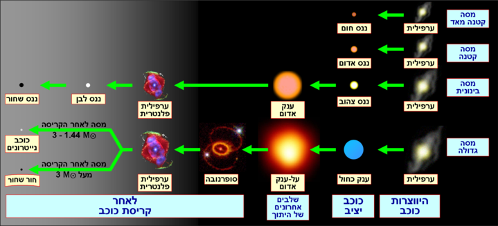 אם מסת כוכב השבת הייתה מלכתחילה קטנה מ 1.44 פעמים מסת השמש שלנו (גבול צ'נדראסקאר) הוא יהפוך לננס לבן. אם מסת כוכב השבת הייתה מלכתחילה בין 1.44 ל 3 פעמים מסת השמש שלנו הוא יהפוך לכוכב נויטרונים. אם מסת כוכב השבת הייתה מלכתחילה גדולה פי 3 ומעלה ממסת השמש שלנו הוא ימשיך לקרוס ויהפוך לחור שחור.