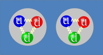 פרוטון (מימין) ונויטרון (שמאל) והקווארקים המרכיבים אותם (באדיבות ויקיפדיה).