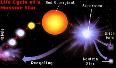 (4). כוכבים כבדים ברמה של לפחות 5-10 מסות של השמש שלנו יגיעו לשלב שהכוכב כולו עשוי ברזל. בשלב זה, כאשר הכוכב מוכן לשרוף ברזל הוא "נתקל בבעיה". היתוך הברזל לא גורם לשחרור אנרגיה ולכן אין כוח שימנע את המשך קריסתו וזה בדיוק מה שקורה. הכוכב קורס לתוך עצמו ומתחמם עד לשלב שבו מתרחשת התפוצצות כלפי פנים (implode). הריבאונד של התפוצצות פנימית זאת נצפה כסופר-נובה. בשלב זה, בתלות במסת הכוכב- מה שנותר מהסופר-נובה יכול להפוך לננס לבן, כוכב נויטרונים או חור שחור.