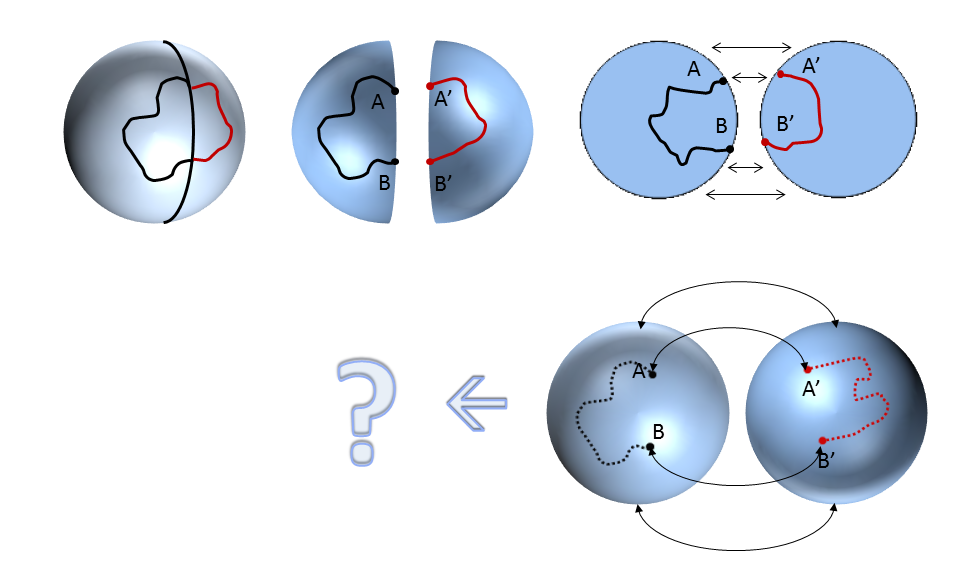כדי לנסות לדמיין את זה, קח את הדוגמה הבאה: על הספירה הדו-ממדית אפשר להסתכל כעל שתי "קערות", שהן עיגולים דו-ממדיים קמורים, המחוברים זה לזה בשפתם (לדוגמה חצאי הכדור הצפוני והדרומי של כדור הארץ). באותו אופן אפשר לדמיין את הספירה התלת-ממדית כשני כדורים תלת-ממדיים מלאים, שמחוברים זה לזה בשפתם, כלומר שכל הקליפה החיצונית שלהם משותפת. במציאות איננו יכולים, כמובן, "לראות" את זה, כיוון שנחוץ ממד מרחבי רביעי כדי "להדביק" שני כדורים בצורה כזאת.