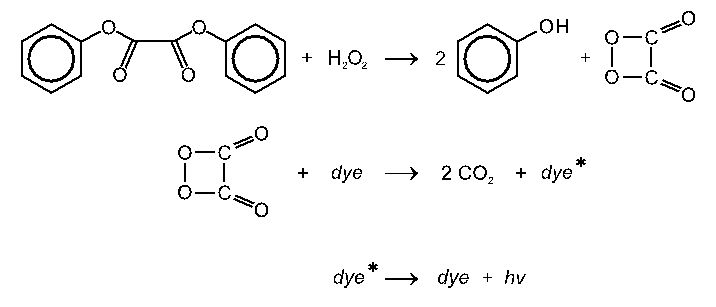 הם עושים שימוש בתגובה כימית בין שני חומרים; רוב המקלורים המסחריים מכילים תמיסת מימן פראוקסידי (מילה מפוצצת המתארת מי חמצן ), פניל אוקסלט אסטר ותמיסת צבע פלורסנטי.