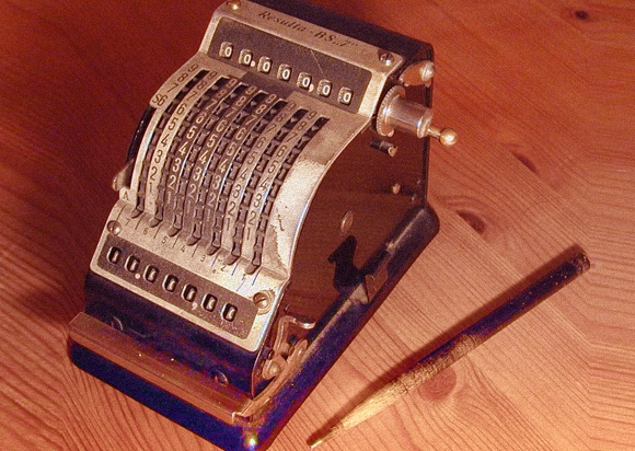 מכונת חישוב מכנית – האב הקדמון של המחשב. בהמשך מתחים חשמליים החליפו את החלקים המכניים. מקור: ויקיפדיה