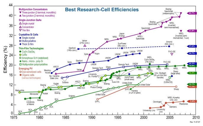 טבלה המראה את אחוזי היעילות של משטחים סולארים מסוגים שונים וההתקדמות במהלך השנים.