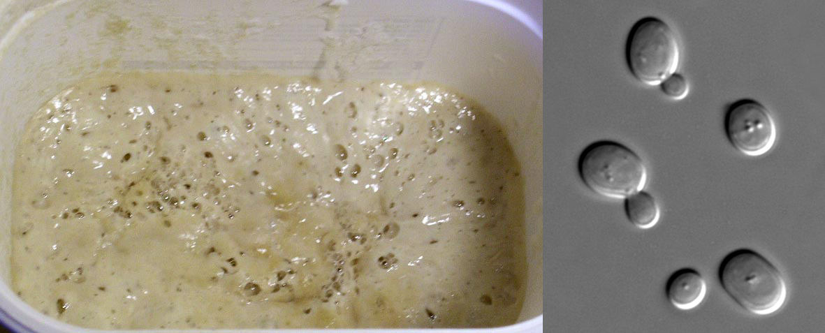 מימין, שמרי האפייה במבט דרך מיקרוסקופ; משמאל: מחמצת שאור | תמונות: ויקיפדיה