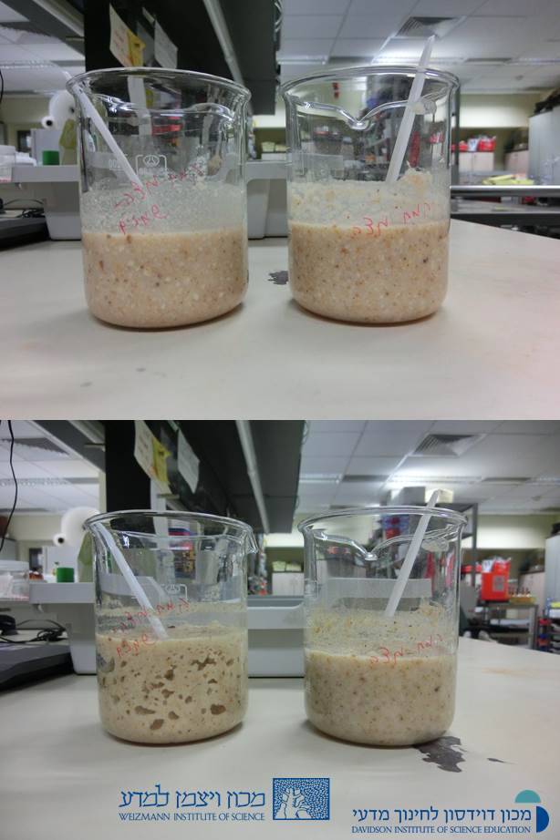 כדי לענות בוודאות על השאלה עשיתי את הניסוי הבא: בשתי כוסות שמתי כמויות זהות של קמח מצה ומים, ולשמאלית מביניהם הוספתי גם שמרים. צילמתי את הכוסות מיד אחרי הערבוב (התמונה העליונה) ושוב כעבור 18 שעות (התמונה התחתונה), הנה התוצאות.