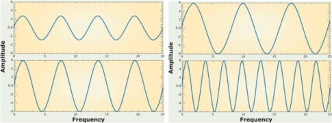בתרשימים ניתן להבחין בין תדרים על-ידי הצפיפות של הגל: ככל שהגל צפוף יותר (יותר מחזורים ליחידת אורך של הציר האופקי) כך התדר גבוה יותר.