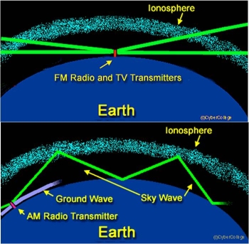 3. גלי שמים (Skiwaves): גלי רדיו בתדר נמוך מוחזרים מהיונוספרה (השכבה העליונה והמיוננת באטמוספרה). ניתן לתאר זאת כמעין מראה בשמיים שמחזירה את השידור אל הקרקע ובכך מגדילה מאוד את מרחק השידור. גלים בתדר גבוה חודרים ליונוספרה ויוצאים לחלל. בתנאים מסוימים הגלים יכולים לחזור שוב מהקרקע ליונוספרה ומשם שוב לקרקע וכך המרחק גדל אף יותר. באופן זה יכול מרחק השידור להגיע לאלפי ק"מ. התקדמות הגלים בדרך זו תלויה בעונות השנה, בפעילות על פני השמש ובעיקר בשעות היום, שכן היונוספרה מושפעת מאוד מרוח השמש (חלקיקים טעונים המגיעים מהשמש לכדור הארץ). בצד היום של כדור הארץ רוח השמש דוחפת את היונוספרה אל עבר האדמה ומקטינה מאוד את טווח השידור. לעומת זאת, בצד הלילה רוח השמש דווקא מרחיקה את היונוספרה ולכן מגדילה את טווח השידור. מסיבה זו, תחנות המשדרות ב-AM בארצות הברית ומקבלות רישיונות לשדר לטווחים ספציפיים, מחויבות להקטין את עוצמת השידור אחרי השקיעה.