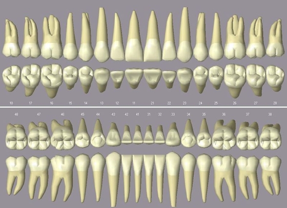 המשנן הקבוע כולל 32 שיניים; 8 חותכות, 4 ניבים, 8 מלתעות ו- 12 טוחנות.