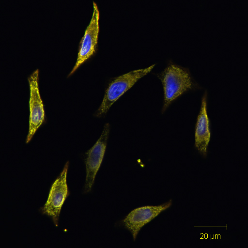 תרבית תאים של ה – cell lineהמכונה "HeLa": מקורו בגידול סרטני בצוואר הרחם של אישה בשם Henrietta Lacks, אשר נפטרה מסרטן זה בשנת 1951. תאים שמקורם בגוף האישה מגודלים בצלחות זכוכית או פלסטיק כבר 60 שנה. התמונה צולמה במיקרוסקופ פלואורסנטי: בצהוב מסומן חלבון המצוי ברשת האנדופלסמטית, ובכחול – ה-DNA שבגרעין התא. מימין למטה מוצג קנה המידה באורך 20 מיקרומטר (= 20 אלפיות המילימטר = 20 מליוניות המטר).