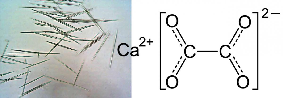 מימין, הנוסחא הכימית של המלח קלציום-אוקסלט. משמאל, גבישי המלח אשר יוצרים באופן ספונטני מחטים זעירות (מוגדל פי 600).