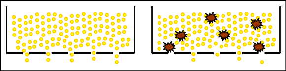 ומה הוא בדיוק אפקט האוסמוזה? נסביר שוב באמצעות ההקבלה למסננת. נניח שיש לנו 2 מסננות, שיכולות להעביר דרכן גרגירי חול, אבל חוסמות את דרכן של אבני חצץ. במסננת אחת (השמאלית בציור למטה) שמנו רק חול, ובמסננת השנייה (הימנית בציור) שמנו תערובת של חול וחצץ. איזה מסננת תסנן בקצב יותר מהיר?