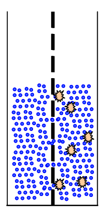 בחצי כלי השמאלי שופכים מים טהורים, ובחצי כלי הימני שופכים בדיוק אותו נפח של תמיסה של מי-סוכר, כפי שמופיע בתמונה הבאה (העיגולים הכחולים מיצגים מולקולות מים, והצורות הוורודות את הסוכר). מה יקרה?
