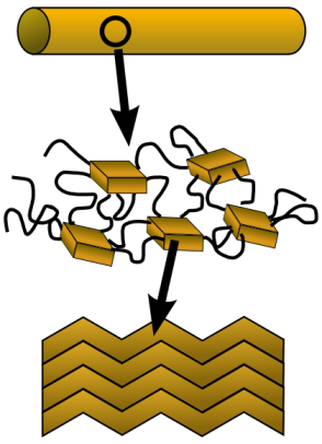 תרשים סכמאתי המראה את האזור האמורפי (שחור) והאזורים הגבישיים (חום). בהגדלה רואים אזור גבישי אחד ואת סידורו המשוכב (ויקיפדיה)