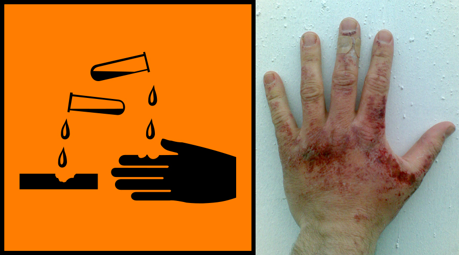 מימין: כוויה כימית – תוצאה אפשרית של מגע חומצה חזקה עם חומר ביולוגי. משמאל – הסמל האירופי הרשמי לסימון חומרים קורסיביים (מקור התמונות מויקיפדיה).
