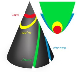 ארבעת חתכי החרוט. הצורות הגאומטריות מתקבלות כאשר מישור חותך את החרוט. התמונה מימין לקוחה מויקיפדיה.