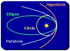 מסלולים אפשריים בשדה כבידה: מעגל, אליפסה, פרבולה והיפרבולה.