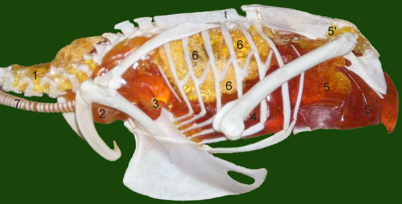 (1) שק אוויר צווארי. (2) שקי אוויר קלביקולאריים. (3). שקי אוויר- חזה קדמיים. (4). שקי אוויר- חזה אחוריים. (5) שקי אוויר בטנים. (6). ריאות. (7). קנה נשימה. (התמונה נלקחה מויקיפדיה)