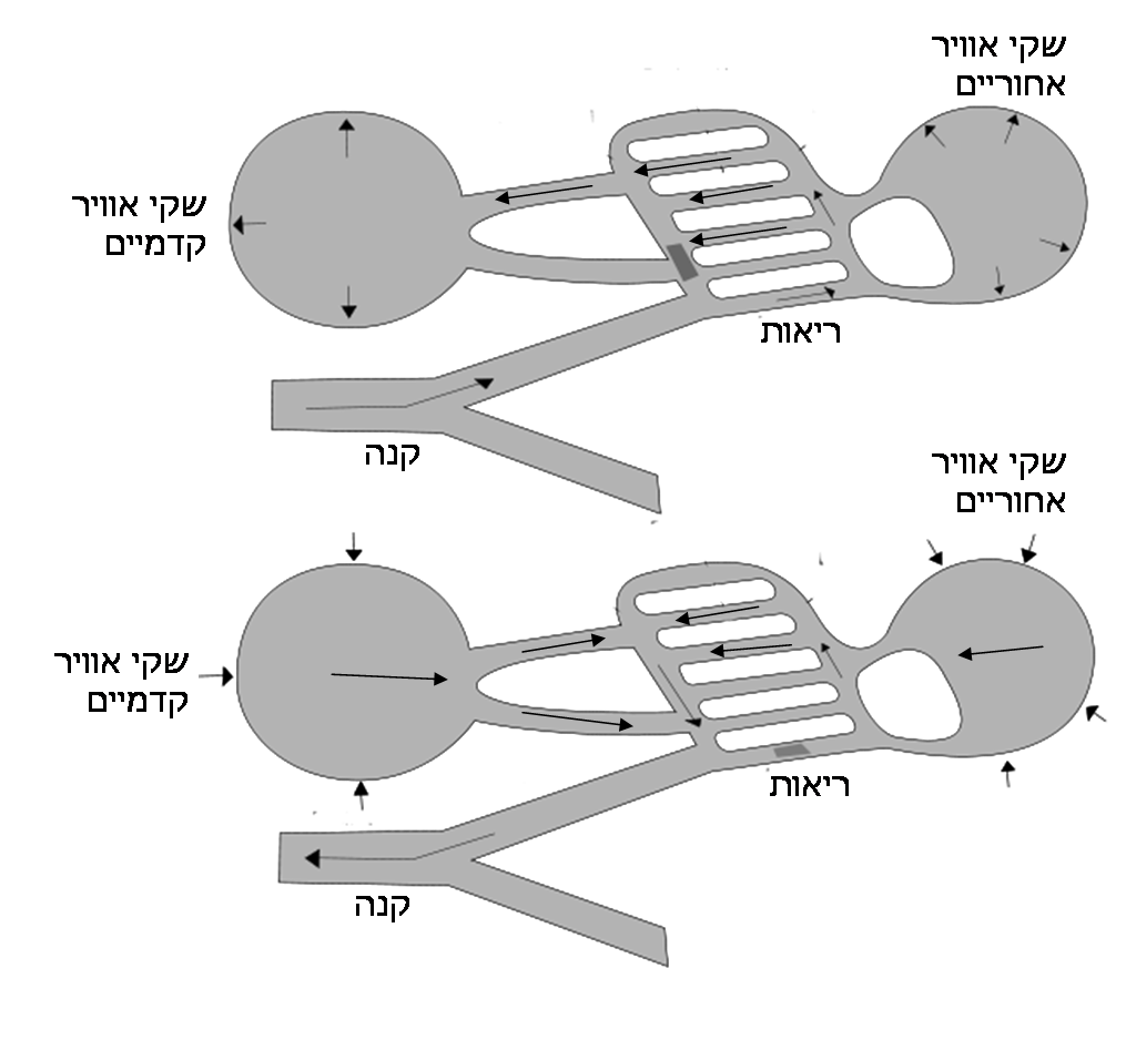 (1). משקי האוויר האחוריים דרך הריאות תוך כדי שהוא מספק חמצן לדם.