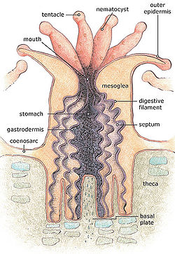 הגוף החי של האלמוג נקרא פּוליפּ, באלמוגים החיים במושבה גודלו של כל פוליפ הוא בין 1 ל-12 מילימטרים, והוא מכיל זרועות צייד בקצה אחד (המסוגלות לצוד פלנגטון, מזונו של הפוליפ, מתוך המים), גוף עם פה במרכז, ו’רגל’ בקצה השני.