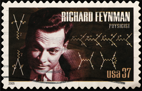 פיינמן הציע פורמליזם שונה, שמאפשר לקבל תוצאות ששקולות לפתרון של משוואת שרדינגר. פיינמן על בול של ארצות הברית | Shutterstock, spatuletail