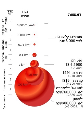 [מדד התפרצות געשית (VEI: Volcanic Explosivity Index)מספק מדד יחסי המאפשר השוואה בין התפרצויות הרי געש שונות. המדד משקלל נתונים רבים, בין השאר- גובה עמוד ההתפרצות, טמפרטורת ונפח החומר הנפלט (החומר קרוי "טפרה", Tephra (אפר ביוונית)), זמן ההתפרצות ועוד].