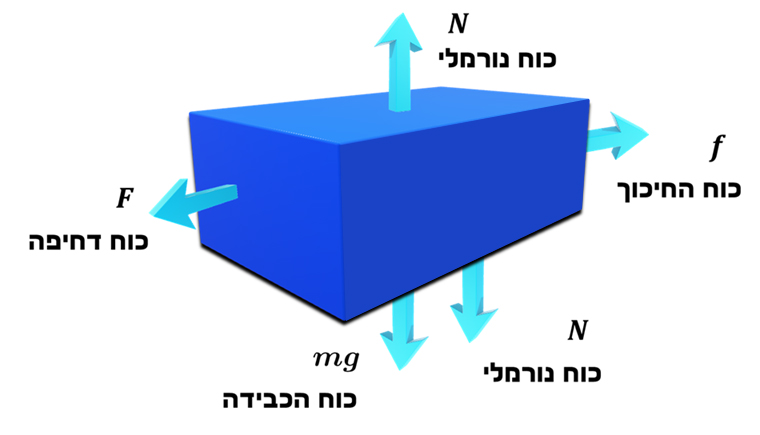 נזכור שעל כל אחת מהלבנים פועלים חמישה כוחות: כוח משיכה או דחיפה אופקי, שאנחנו מפעילים עליהן כדי להזיז אותן; כוח חיכוך אופקי המנוגד לכיוון התזוזה של הלבנה; כוח כבידה שמפעיל עליהן כדור הארץ, המושך אותן כלפי הקרקע; ושני כוחות נורמליים (מלשון נורמל, כלומר ניצב למישור) אנכיים, שמופעלים על ידי השכבה שמעל הלבנה וזו שמתחתיה. הכוחות הנורמליים הם למעשה הסיבה שמוצקים אינם קורסים זה לתוך זה, ומקורם בכוחות חשמליים מיקרוסקופיים. אגב, לרוב יש קשר מתמטי פשוט בין החיכוך לבין הכוח הנורמלי.