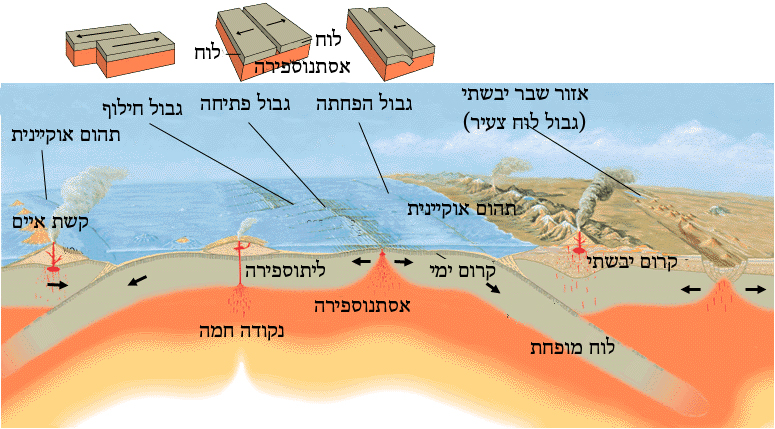איור 1: סוגי גבולות טקטוניים בין לוחות. תמונה לקוחה מויקיפדיה.