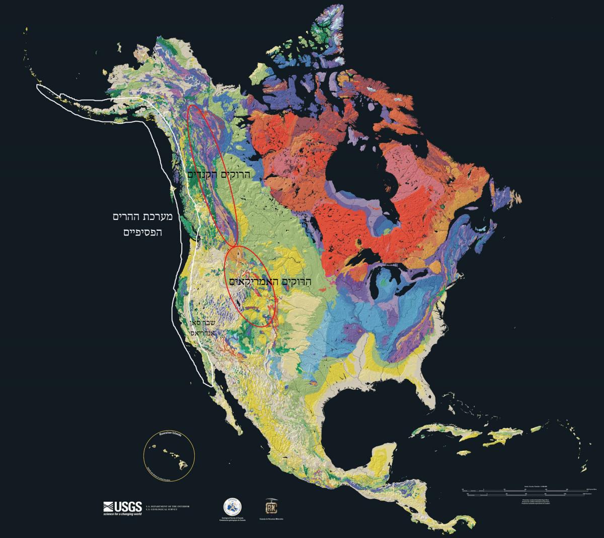 איור 2: הרי הרוקים והרי החוף הפסיפיים במערב ארצות הברית. הצבעים במפה מציינים את גיל הסלע (העתיקים ביותר באדום ולפי סדר סגול כחול ירוק צהוב ובז' הצעיר ביותר). תמונה לקוחה מויקיפדיה.