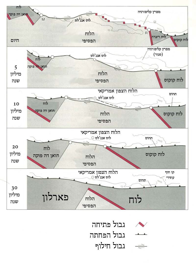 איור 3: שקיעת לוח פארלון מתחת ללוח הפסיפי לאורך 30 מיליון שנה. הכוחות הפועלים יצרו את רוב התופעות הגיאולוגיות במערב אמריקה, כגון הרי הרוקים, מערכת ההרים הפסיפית, שבר סאן אנדריאס, ומערכת הרי הגעש הצפון קורדילית. תמונה לקוחה מויקיפדיה.