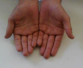 מימין: כפות ידיים תלת-ממדיות כיראליות תלת-ממדית; משמאל: תרשים דו-ממדי של שתי ידיים – אלו צורות חופפות, והן כיראליות רק דו-ממדית.