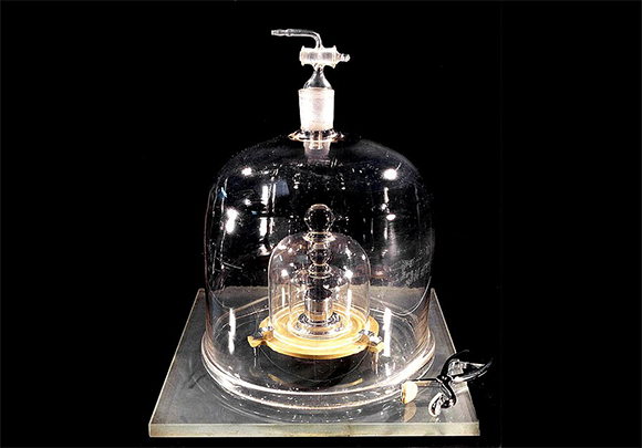 The BIPM also produced a weight that defined the kilogram. The standard kilogram weight, housed within protective glass enclosures | BIPM
