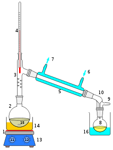 The mixture to be distilled (15) is heated, the vapors rise up the still head (3) on top of which is a thermometer (4). The vapors flow through the condenser (5), which is cooled down by an external water current (6 & 7). Droplets from the condensed fluid are collected in the receiving flask (8).