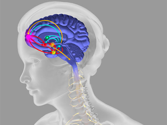 The dopamine pathway starts in a region of the midbrain and brainstem, called the ventral tegmental area (VTA, marked in a light blue circle). Dopamine secreted in the VTA (blue arrows) acts on different regions of the brain, including the nucleus accumbens (red circle) and the prefrontal cortex (pink circle) | Fernando da Cunha, Science Photo Library