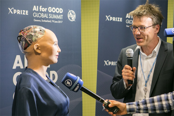 Amodst the debate, the robot Sophia, asserted that robots have leadership potential, citing their lack of social biases compared to humans. Sophia participating in an interview at the conference | flickr, ITU Pictures