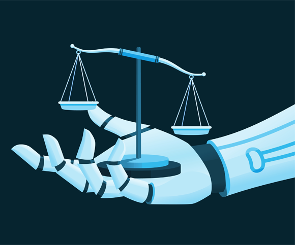 It is crucial to legislate the regulation in this evolving field, defining clear laws for robots and their creators. The symbol of justice in a robot’s hand | aniqpixel, Shutterstock