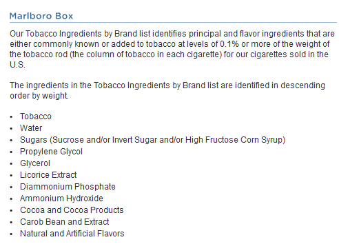 Here we take a look at Philip Morris USA, manufacturer of Marlboro cigarettes, L & M, Parliament, etc. Below is a list of materials included in the tobacco mixture of Marlboro cigarettes (ingredients listed also represent other cigarettes):