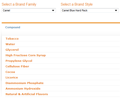 And R.J. Reynolds’ cigarettes, a competitor tobacco company, which manufactures, among other brands, Winston, Camel, Pall-Mall and Lucky Strike, contain the exact same components. This is the list of ingredients in Camel Blue cigarettes: