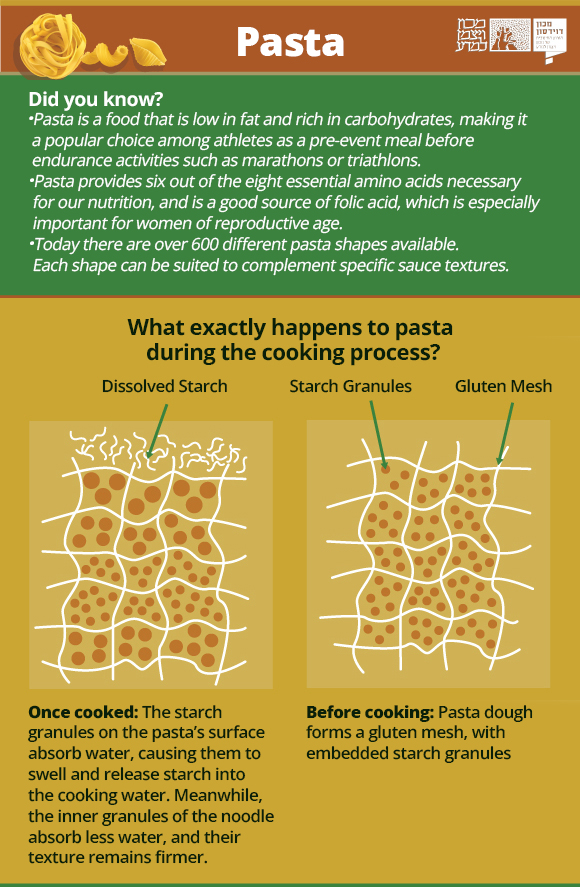The last step in pasta preparation is cooking it in boiling water. During this step, the protein network and starch granules packed together in the flour absorb water and swell. This transformative process leads to the outer layer of proteins being torn, while a portion of the starch dissolves and is released into the cooking water. In this pivotal step, the protein network and starch granules nestled within the flour eagerly absorb water and undergo expansion. Deep within the pasta noodle, where water penetrates, the starch granules maintain a partial structural integrity, as will the protein network. When the pasta is cooked 'al dente'—Italian for 'to the tooth’— it is removed from the water slightly before the center softens completely, leaving a slight chewiness thanks to the intact starch granules and resilient protein network.The unaltered starch granules and the stable protein network are responsible for the slight firmness that can be experienced during chewing.