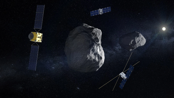 Detectives at the crime scene. The Hera spacecraft (left) with two small satellites around the asteroids Didymos and Dimorphos | Illustration: ESA