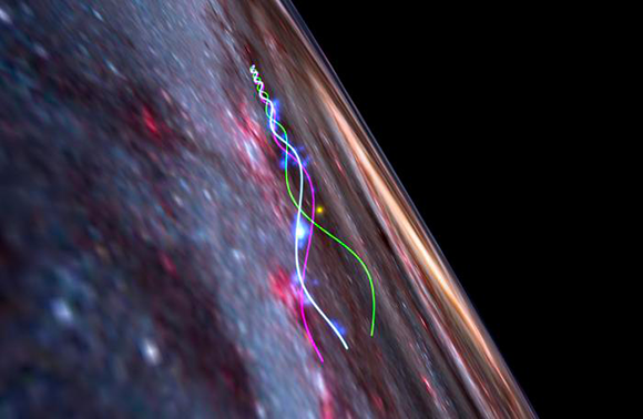 The movement of the gaseous material resembles that of a progressing wave, akin to ocean waves. Illustration of the wave's motion: The white line illustrates its current shape and trajectory, while the green and purple lines predict its future movement | Ralf Konietzka, Alyssa Goodman, and WorldWide Telescope