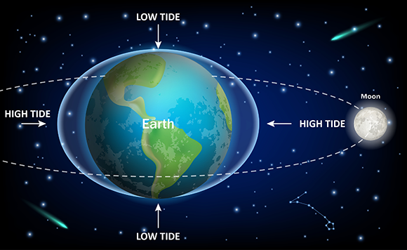 Tides create friction between the oceans and Earth's crust, slowing the planet's rotation. The Moon’s influence on Earth's tides | Siberian Art, Shutterstock.