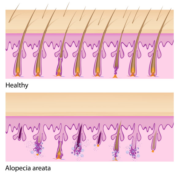 Healthy hair follicles (upper panel) and hair follicles damaged by alopecia areata (lower panel) | Alila Medical Media, Shutterstock