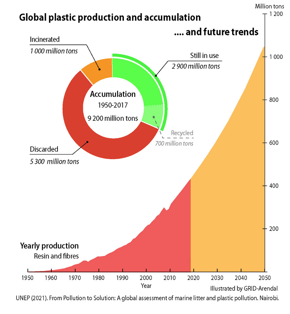 World plastic production is increasing rapidly, with annual output projected to double by 2050, unless action is taken. The rate of recycling is failing to keep pace | Source: UN Environment Programme Report, 2021, Illustrated by GRID-Arendal