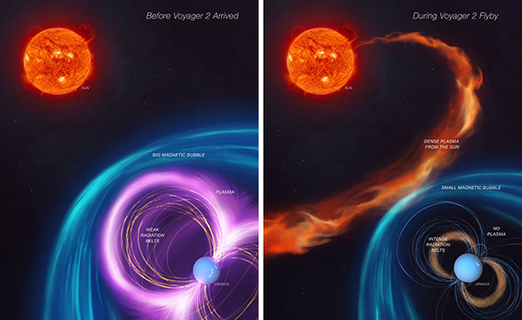 A rare event. Solar wind blew Uranus’s plasma away, altering the shape of its magnetosphere. The planet’s usual state (left) compared to the altered state during the solar storm observed by Voyager during its 1986 Uranus flyby | Illustration: NASA/JPL-Caltech
