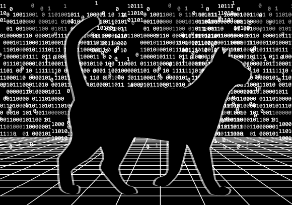 A thought experiment where a can is in two positions simultaneously, akin to a particle in superposition in the quantum world. Schrodinger's cat with a background of the digits one and zero | cybermagician, Shutterstock