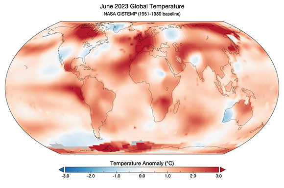 Widespread heatwaves in the hottest June ever recorded. The global land surface temperature in June this year, compared to the average June temperature in the years 1980-1951 | NASA's Goddard Institute for Space Studies
