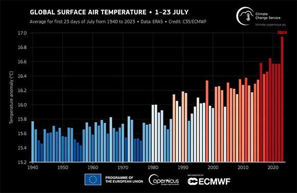 The extreme heat of July this year shattered previous heat records by a significant margin. The curve illustrates the average temperature of the first 23 days of July, from 1940 to 2023 | C3S/ECMWF