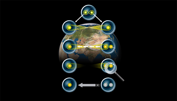 According to current knowledge, quantum entanglement does not enable information transfer that is faster than the speed of light. Illustration of measuring entangled particles, one in China and the other in Austria | Jose Antonio Peñas / Science Photo Library